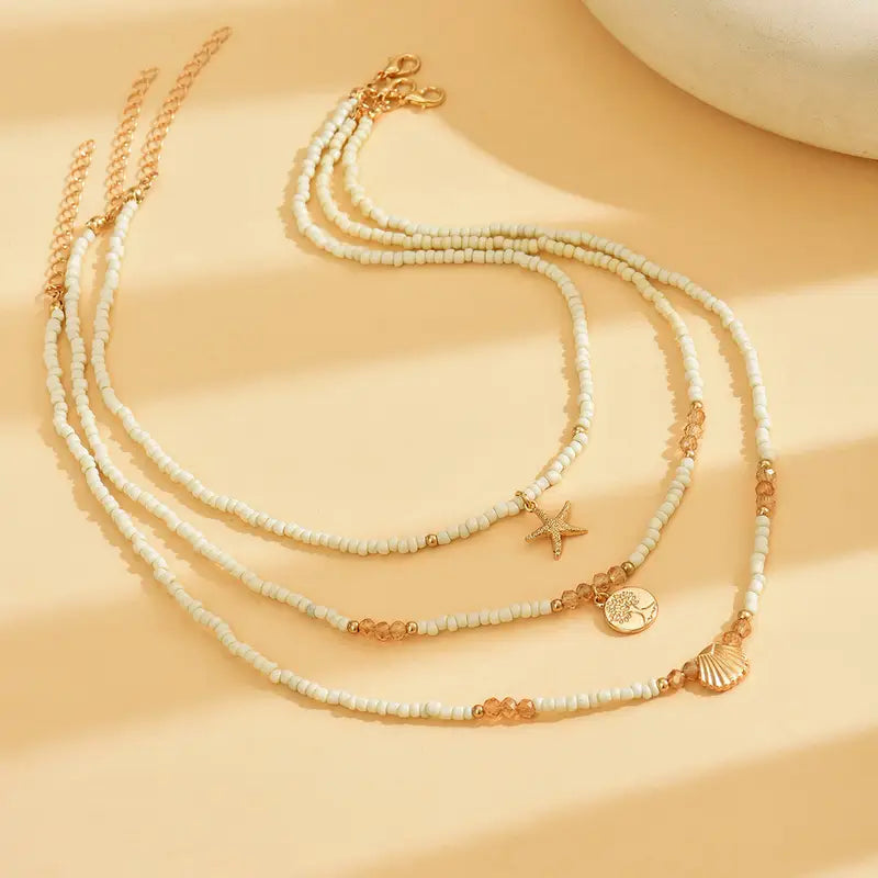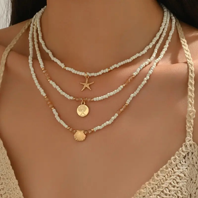Collier Style Bohème à perles beige et blanc 3 pièces, Pendentif,